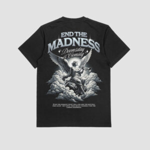 This black graphic t-shirt features a bold and striking design with a dramatic message. The phrase “END THE MADNESS” is displayed prominently in large, stylized silver-gray letters with a glowing, otherworldly effect. Below it, the foreboding text “Doomsday is Coming” adds a dark and mysterious tone.